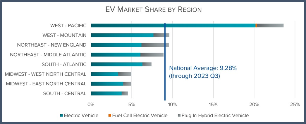 - One-third of ACC II states have an EV market share below the national average of 9.28 percent for the first three quarters of 2023;