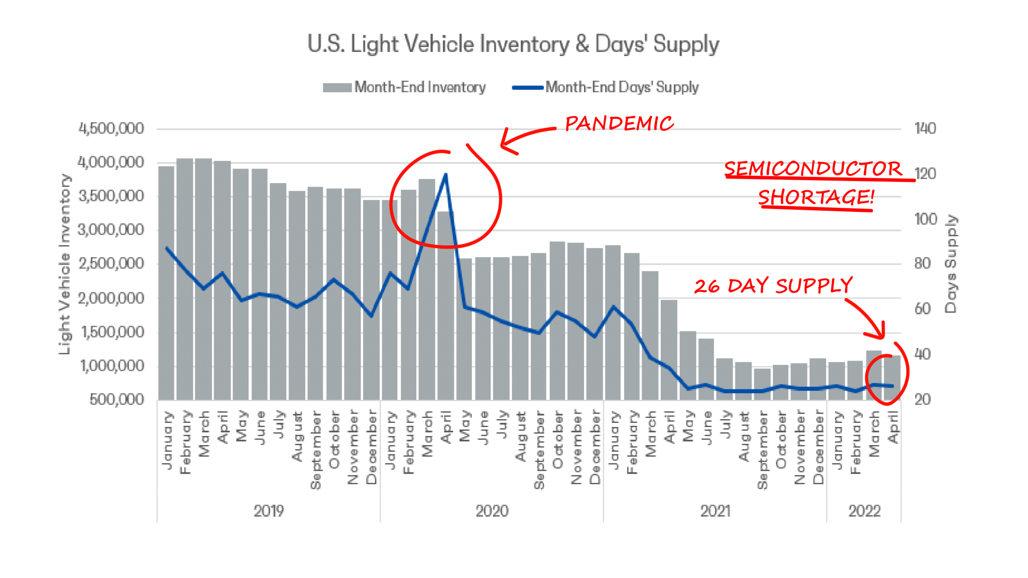 Pre-pandemic, U.S. auto inventory hovered between 60-80 days.